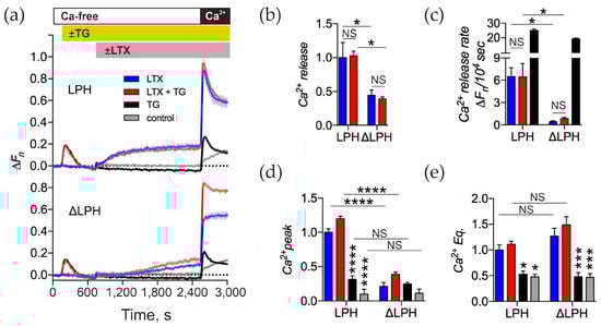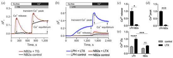 As we showed above, the αLTX-triggered release of neurotransmitters from motor neurons in a Ca2+e-free medium requires release of Ca2+, which at least in part comes from the ER (Section 2.2). Therefore, we investigated whether αLTX also triggers the release of Ca2+ from the ER in our model cells expressing the two receptor variants. LPH- and ΔLPH-expressing NB2a cells were treated with 0.3 μM TG in a Ca2+-free medium and then stimulated with αLTX (Figure 6).
