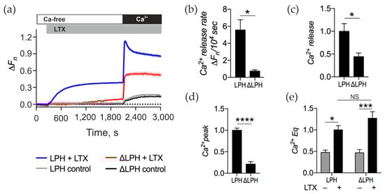 To study the αLTX-induced effects on Ca2+ release from intracellular stores and influx of Ca2+e, NB2a cells (un-transfected or transfected with LPH) were loaded with Fluo-4 AM and stimulated in a three-step protocol. First, the cells were incubated in a Ca2+-free buffer. Then, αLTX and/or different pharmacological agents were added to detect their effects on Ca2+ release. Subsequently, the cells were exposed to 2 mM Ca2+e to reveal changes in Ca2+ influx (Figure 4b). The changes in Fluo-4 fluorescence were continuously recorded as described in Section 5. In the Ca2+-free medium, αLTX caused release of intracellular Ca2+ only in ADGRL1-expressing cells (Figure 4b,c). This release occurred over several minutes, reaching a plateau which was apparently determined by the new equilibrium between [Ca2+]cyt and Ca2+ extrusion mechanisms (Figure 4b). Upon the addition of Ca2+e, there was an immediate large influx of Ca2+, which soon decayed to a relatively high, new level (Ca2+ Eq). This transient opening of Ca2+-permeable channels was absent in control cells, while a small peak of Ca2+ influx sometimes appeared in αLTX-treated un-transfected cells due to a low non-specific binding of αLTX to cell membranes (Figure 4b,d). Also, the Ca2+ Eq in control cells was lower than in αLTX-treated cells (Figure 4b,e); this could involve several αLTX-mediated mechanisms: formation of toxin pores in the membrane, opening of some permanent Ca2+ channels and/or perturbation of Ca2+ extrusion.