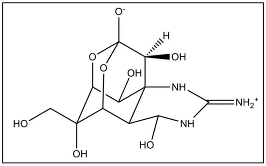 TTX is a heat-stable compound that remains stable at boiling temperatures, making it resistant to destruction through cooking [39], except in the presence of strongly acidic or alkaline solutions. It displays an acid–base behavior with a dissociation constant, pKa, of 8.76; therefore, in physiological conditions, the toxin exists as a cation in the NH3 group (https://pubchem.ncbi.nlm.nih.gov/compound/11174599 (accessed on 15 January 2024)).