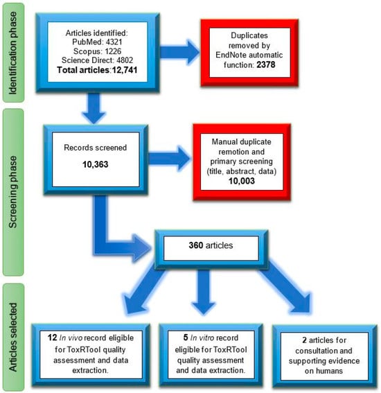 The methodological quality of the selected articles was evaluated using the full-text articles. Aspects such as the design, execution, analysis, and reporting of the studies, which may have led to biased results, were considered. The selection of articles for data extraction was performed on the basis of expert judgment by one operator and, in the case of doubt, after discussion with one or two other experts, who nevertheless randomly re-examined a small subsample of the literature under review. Articles selected for hazard characterization were evaluated for their reliability, relevance, and adequacy on the basis of the Klimisch score [61] by using the ToxRTool (a tool to assess the reliability of toxicological data), a spreadsheet developed by ECVAM (https://joint-research-centre.ec.europa.eu/scientific-tools-and-databases/toxrtool-toxicological-data-reliability-assessment-tool_en (accessed on 10 September 2023)) [62]. Each record selected for data extraction was screened independently by two researchers, and since no striking discrepancy on the outcome of the ToxRTool occurred, it was not necessary to involve a third expert. All the data considered useful for hazard characterization were captured in a preliminarily defined excel data extraction form, and the certainty assessment was performed on the basis of expert judgment.