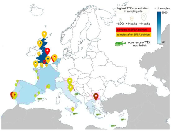 In 2017, the EFSA pointed out that a low number of studies considered TTX occurrence in European bivalves and gastropods. The main areas screened for TTXs were England, Portugal, and Greece, and some data were from the Netherlands and United Kingdom (see [16]). The upper-bond 95th percentile concerning all received data on TTX in bivalves was 28 μg/kg and the highest reported level among all data was 253 μg/kg in oysters.