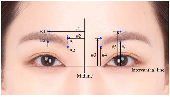 - Kunjur, J.; Sabesan, T.; Ilankovan, V. Anthropometric analysis of eyebrows and eyelids: An inter-racial study. Br. J. Oral. Maxillofac. Surg. 2006, 44, 89–93. [Google Scholar] [CrossRef] [PubMed]