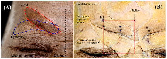 - Yang, H.M.; Kim, H.J. Anatomical study of the corrugator supercilii muscle and its clinical implication with botulinum toxin A injection. Surg. Radiol. Anat. 2013, 35, 817–821. [Google Scholar] [CrossRef]