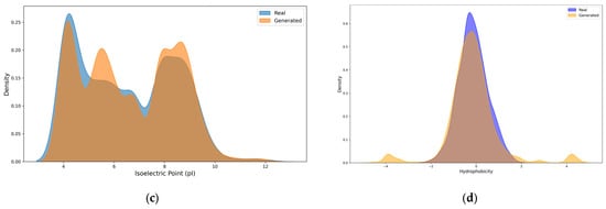 The amino acid composition analysis (Figure 1a) revealed that the generated sequences closely resemble the real conotoxins, especially in the proportions of key amino acids such as cysteine(C) and glutamic acid(E), which play critical roles in conotoxin structure and function [26]. For charge distribution (Figure 1b), both the generated and real sequences exhibited similar profiles, with the majority of sequences having a charge between 0 and +3. This overlap indicates that the generated sequences possess charge properties comparable to real conotoxins. However, the generated sequences show a slightly higher proportion at zero charge, which may be attributable to a bias toward neutral charges in the model itself. Isoelectric point (pI) analysis (Figure 1c) showed that both groups had overlapping distributions in the range of 4 to 10, with a peak at 6–8, further confirming the reasonable physicochemical properties of the generated sequences. Lastly, we computed the hydrophobicity scores of both the generated and real conotoxins using the Kyte–Doolittle hydropathy index. The hydrophobicity distributions (Figure 1d) demonstrated a high degree of similarity, with both groups centered near zero, a property critical for the stability and functionality of conotoxins. Collectively, these results underscore the ability of the ConoGPT model to capture the essential features of real conotoxins in its generated sequences.