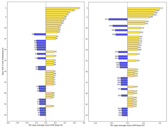 Shannon’s entropy divergence between the distributions of length 2 (left) and length 3 (right) subsequences of FASTA characters in conotoxins from the training set (real) or conotoxins created by the generator (generated). Blue bars indicate a greater prevalence of a particular subsequence in real conotoxins, while gold bars indicate a greater prevalence in generated conotoxins. For length 2 subsequences, the average entropy was 7.94 for real sequences and 7.79 for generated sequences, while for length 3 subsequences, the average entropy was 11.42 for real sequences and 11.38 for generated sequences. For reference, the distribution of subsequences drawn from uniformly random sequences results in a maximum entropy of ~8.64 for length 2 subsequences and ∼12.97 for length 3 subsequences. Both groups in both plots feature a lower entropy than the maximum; thus, we should expect to see meaningful structures in each group.