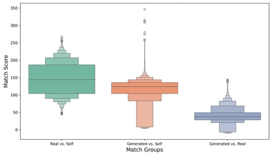 Distribution of sequence match scores across three groups: “Real vs. Self”, “Generated vs. Self”, and “Generated vs. Real”. The “Real vs. Self” group displays a higher median score with a concentrated distribution, while the “Generated vs. Self” group shows greater variability and diversity. The “Generated vs. Real” group demonstrates the lowest median score, emphasizing the novelty of generated sequences compared to real conotoxins.