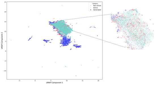 UMAP visualization of the embedding space for generated sequences (mint green) and real sequences, with active real sequences shown in red and inactive real sequences shown in blue. The magnified view highlights the overlap between generated sequences and active real sequences, demonstrating the ability of the model to generate sequences closely resembling real active ones while also exploring new regions of the embedding space.