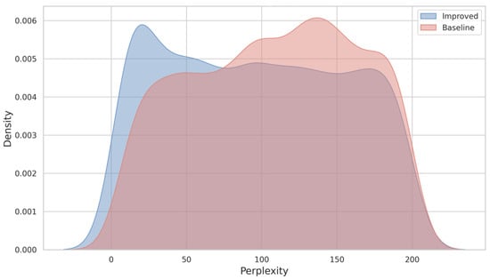 Density comparison of perplexity distributions for sequences generated by the baseline model (red) and the improved model (blue). The improved model demonstrates slightly lower average perplexity compared to the baseline model.