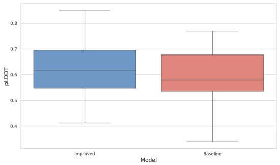 Box plot comparison of pLDDT distributions for sequences generated by the baseline model and the improved model.