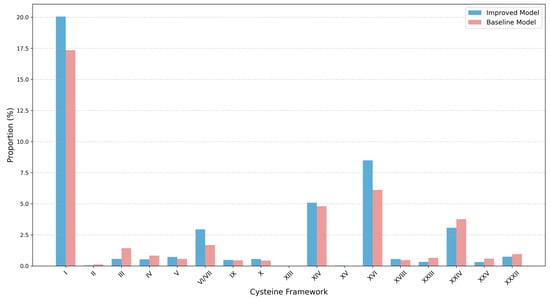 The cysteine framework of conotoxins is closely related to their disulfide connectivity, which forms the basis for the improved model’s integration of disulfide bond information. To assess the influence of this improvement, we compared the distribution of known cysteine frameworks between the improved model and the baseline model, with the results shown in Figure 8.