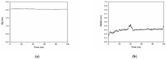 During the 100 ns simulation, the radius of gyration (Rg) values stabilized between 2.009 and 2.105 nm, with a final value of 2.057 nm at 100 ns, indicating that the protein structure remained compact. The root-mean-square deviation (RMSD) values fluctuated slightly in the first 20 ns but stabilized over time, suggesting that the system reached equilibrium.