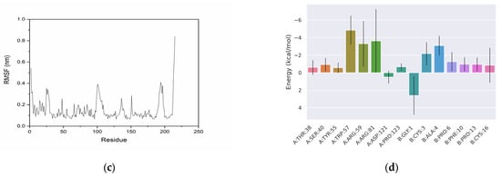 Binding free energy analysis showed a total binding free energy of −19.45 ± 8.2 kcal/mol, confirming strong interactions between the protein and peptide. Residue interaction analysis revealed key contributions from protein residues TRP57, ARG59, and ARG81, highlighting their critical role in binding stability. Aromatic residues (such as TRP) and positively charged residues (such as ARG) often play critical roles in protein–ligand interactions [35,36,37]. We hypothesize that these residues may contribute to binding stability through different interaction mechanisms. For instance, TRP57 may stabilize the protein–peptide complex through hydrophobic interactions, while ARG59 and ARG81 may further enhance binding stability through electrostatic interactions and hydrogen bond formation.