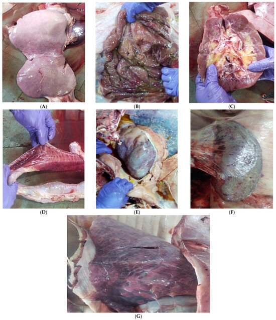 Gross findings of post-mortem of different vital organs: (A) haemorrhages and congestion in liver with paleness, (B) oedematous abomasum with congestion and ulceration, (C) haemorrhages in kidney, (D) haemorrhages in intestinal mucosa, (E) fluid filled pericardium, (F) petechial haemorrhages in the spleen, (G) congestion in lungs.