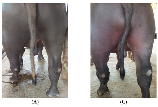 (A–D) Tail gangrene before (A,B) and after (C,D) treatment in affected buffalo bull.