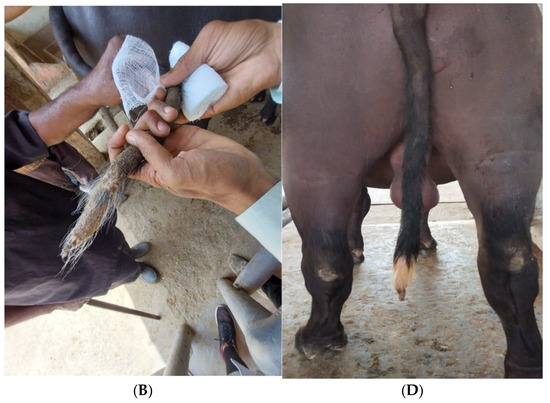 (A–D) Tail gangrene before (A,B) and after (C,D) treatment in affected buffalo bull.