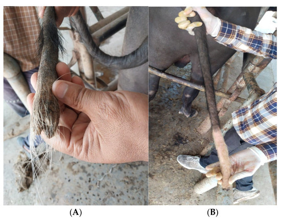 The hairs around the affected area of the tail were slipped and the tail was washed with a diluted (0.01%) solution of KMNO4. The greasy or oily exudate deposited on affected parts was cleaned with methylated spirit. After drying, the dressing was conducted with povidone iodine solution (10%) and repeated twice a day for two consecutive days. Phenyl (Bengal Chemicals and Pharmaceuticals, Kolkata, India) in diluted form at various concentrations [on days 3–4 (1:4), 5–6 (1:2) and 7–8 (1:1)] was used twice a day for dressing the affected tail region. The bandages wrapped around the affected part of the tail were replaced on alternate days. After day eight, the tail dressing was continued with Lorexane® ointment (Virbac Animal Health Pvt. Ltd., Mumbai, India), and Betadine® (Win-Medicare Pvt. Ltd., New Delhi, India) for the next week. Systematically, an oxytetracycline long-acting (Bioxy-LA®, Brilliant Bio-pharma, Hyderabad, India) of 10 mg per kg body weight with repetition on days 0, 3 and 6 and meloxicam (Melonex®, Intas Pharmaceuticals Ltd., Ahmedabad, India) of 10 mg per kg body weight daily for 7 days were injected intramuscularly to the affected buffaloes. An injection (S/c) ivermectin of 1 mL per kg body weight (two times at weekly intervals) and an injection (I/m) L-carnitine (Dozliv®, Carus Laboratories Pvt. Ltd., Karnal, India) of 10 mL per animal for 10 days; a multivitamin injection (V-5®, Care Vet Pharma, Ludhiana, India) of 5 mL I/m at weekly intervals for four shots and a multimineral injection, Stimvet® (Wellcon Animal Health Pvt. Ltd., Agra, India) of 5 mL per animal once only were used.