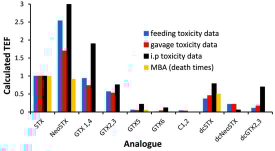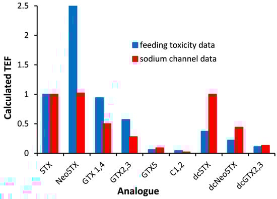 In 2009, the EFSA proposed TEFs for PST analogues based on acute toxicity determined by the i.p injection of mice. However, the CONTAM (The Panel on Contaminants in the Food Chain) Panel noted that further toxicological data were needed to establish robust TEFs and that these values should be set on the basis of acute oral toxicity data [44]. In 2016, the FAO/WHO panel updated TEF values for any analogues where additional data were available, with preference given to TEFs derived orally [41].