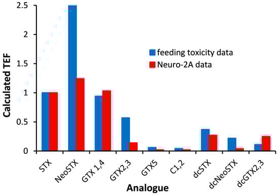 The most obvious difference in the TEFs derived by the Neuro-2A assay and those derived using oral mouse toxicity data were those for NeoSTX which were 1.24 and 2.54, respectively. TEFs generated by mouse toxicity data were also higher for GTX 2&3 and dcNeoSTX. This means that the Neuro-2A analysis of samples containing these analogues would underestimate toxicity.