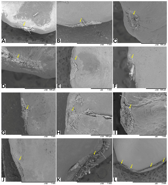 Seeds from GBG fruits were placed on modified CZA, with or without A. flavus spores, and incubated at 25 °C for 5 days. Based on a visual assessment of SEM images, three classifications of hilar fissure morphology in seeds incubated without spores were revealed (Figure 1): nearly closed (Figure 1A–C), semi-closed (Figure 1D–F), and open (Figure 1G–J). A similar classification was observed in seeds incubated with spores (Figure 2): nearly closed (Figure 2A–F), semi-closed (Figure 2G–K), and open (Figure 2L). The AF concentrations in the seeds (Table 5) appeared to correlate with the hilar fissure classification. The accumulation of fungal mycelia, which formed infection pads on the hilar fissure (Figure 2), increased with the width of the fissure opening.