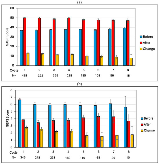 2.2. Cycle-by-Cycle Analysis of GAS T-Scores and Pain Scores