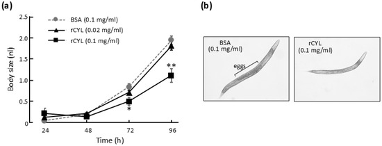 To test the inhibitory activity of rCYL on the development of C. elegans larvae, approximately 100 eggs were incubated on NGM plates containing rCYL at 0.02 mg/mL (3.1 µM) or 0.1 mg/mL (16 µM) (referred to as rCYL–medium) or bovine serum albumin at 0.1 mg/mL (BSA–medium, as a control). After 24, 48, 72, and 96 h, the number and size of the larvae on each medium were recorded (Figure 1a). The hatching percentage, which was determined by calculating [100 × (number of larvae)/(number of eggs)], after 24 h was highly similar (approximately 80–90%) between the rCYL–medium and BSA–medium, indicating that rCYL did not inhibit hatching. After 96 h, approximately 90% of nematodes survived on each medium, indicating that rCYL was not lethal for nematodes. However, rCYL at 0.1 mg/mL in the diet medium apparently reduced the body volume of nematodes to approximately 60% (p-value < 0.01) of the body volume of the control (Figure 1a), indicating that rCYL inhibited the development of nematodes. Representative images of the nematodes reared on medium containing 0.1 mg/mL BSA and 0.1 mg/mL rCYL for 96 h are shown in Figure 1b. The nematode reared on BSA–medium was pregnant, i.e., contained eggs in its body, whereas the nematode reared on rCYL–medium had a relatively small body size and was not pregnant. Among the approximately 100 nematodes reared on BSA–medium, 98.6% ± 1.3% (the mean value ± standard deviation) of nematodes were pregnant after 96 h incubation. By contrast, 94.7% ± 0.6% (p < 0.01) and 81.0% ± 2.0% (p < 0.001) of nematodes reared on medium containing rCYL at 0.02 mg/mL and 0.1 mg/mL, respectively, were pregnant. Thus, rCYL in the diet medium reduced the ratio of pregnant nematodes, dose-dependently.