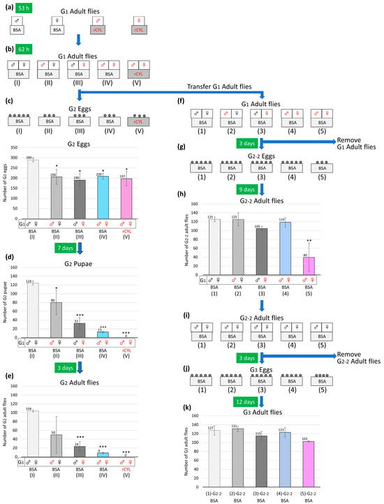 To examine the effects of rCYL on egg-laying and the development of the next generation, male and female adult flies (G1 generation) were separated within 12 h after emergence and reared on solid medium containing 0.3 mg/mL rCYL or 0.3 mg/mL BSA at 25 °C for 53 h, as shown in Figure 2a. Then, 10 each of the virgin G1 males and females reared on the rCYL–medium or the BSA–medium were transferred onto fresh BSA–medium and mixed in the following combinations: “BSA–male/BSA–female”, “rCYL–male/BSA–female”, “BSA–male/rCYL–female”, and “rCYL–male/rCYL–female” (Figure 2b). In addition, 10 each of the G1 males and females in the combination “rCYL–male/rCYL–female” were transferred on to fresh rCYL–medium (Figure 2b). The G1 adult flies in the five combinations, “BSA–male/BSA–female/BSA–medium”, numbered as (I) “rCYL–male/BSA–female/BSA–medium” (II), “BSA–male/rCYL–female/BSA–medium” (III), “rCYL–male/rCYL–female/BSA–medium” (IV), and “rCYL–male/rCYL–female/rCYL–medium” (V), mated freely and laid eggs on each medium at 25 °C for 62 h, in triplicate per combination (Figure 2b). After removing the G1 adult flies from each medium, the G2 eggs laid on each medium were counted (Figure 2c). After another 7 and 10 days, the total numbers of G2 pupae and G2 adult flies on each medium were counted, respectively (Figure 2d,e).