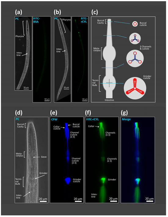 In an attempt to identify the target sites of rCYL in C. elegans and D. melanogaster, rCYL was labeled with fluorescein isothiocyanate (FITC), referred to here as FITC-rCYL. FITC-rCYL exhibited the same antifungal activity as that of rCYL against Aspergillus nidulans [27]. FITC-labeled BSA (FITC-BSA), as a control, was commercially obtained. Figure 3a shows that the nematode fed on medium containing 0.2 mg/mL FITC-BSA exhibited a faint fluorescent signal along the intestine. Figure 3b shows that the nematode fed on medium containing 0.2 mg/mL (31 µM) FITC-rCYL exhibited intense fluorescent signals along the pharynx “https://www.wormatlas.org/hermaphrodite/pharynx/mainframe.htm (accessed on 26 February 2025)”, in addition to a faint signal along the intestine. The pharynx is a muscular feeding organ that begins at the buccal cavity and terminates posteriorly at the terminal bulb (Figure 3c) [31]. Pharyngeal contractions cause the posterior movement of alimentary contents towards the intestine, and the grinder ruptures the contents during feeding [32]. The pharynx is lined with cuticle (Figure 3c) [33,34]. Although the chemical composition of the pharyngeal cuticle remains poorly defined, it contains a chitin–chitosan matrix, proteoglycans, and amyloidogenic proteins [34,35,36,37,38]. Figure 3d,e show the staining pattern of Calcofluor white (CFW), which has been used as a chitin probe in many biological systems and was reported to specifically stain the pharyngeal cuticle in nematodes [38]. Figure 3f,g show that FITC-rCYL localized at the pharyngeal cuticle of the nematode, which was stained with CFW.