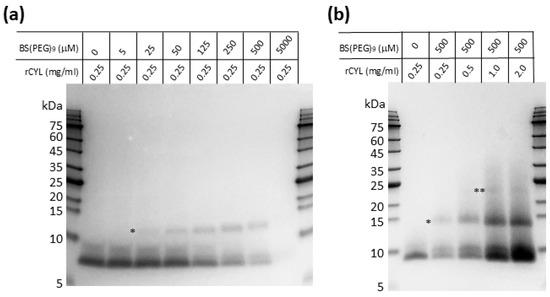 Protein cross-linking of rCYL. (a) rCYL was cross-linked via incubation with bis-N-succinimidyl-(nonaethylene glycol) ester [BS(PEG)9], and the reaction mixture was resolved by SDS-PAGE. The protein bands were detected using Coomassie brilliant blue staining. By increasing the concentration of BS(PEG)9 from 5 µM to 500 µM, a band representing the rCYL dimer was observed at ~13 kDa (indicated with an asterisk). When the cross-linker was employed at 5 mM, the protein bands disappeared from the gel. (b) As the concentration of rCYL increased in the presence of BS(PEG)9, two protein bands were observed at ~13 kDa (indicated with an asterisk) and ~24 kDa (indicated with the double asterisks), which represent the rCYL dimer and the rCYL tetramer, respectively.