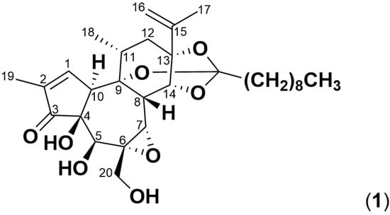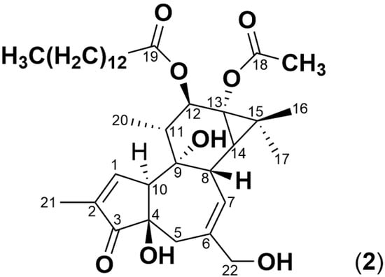 The internal standard phorbol 12-myristate 13-acetate (PMA (2), also known as 12-O-tetradecanoyl-phorbol-13-acetate) was purchased from Merck (Castle Hill, NSW, Australia). Solvent compositions were mixed v/v as specified. ChemDraw Professional version 19.0 (PerkinElmer, Waltham, MA, USA) was used to draw all chemical structures and generate molecular formulae.