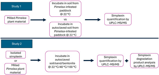 Currently, there is limited knowledge of simplexin degradation by soil microorganisms or of the effect of temperature, although the previous field study did seemingly indicate degradation in the field [1]. This study aimed to determine whether simplexin in P. trichostachya plant material can be degraded in soil collected from Pimelea-infested paddocks and whether soil microbes capable of simplexin degradation were present. The study also aimed to investigate the effect of temperature on isolated simplexin and simplexin in Pimelea plant material when incubated with field-collected soil and other materials. A summary of the experiments undertaken is depicted in Figure 3. Both P. trichostachya plant material and soil collected from Pimelea-infested paddocks were obtained from infested regions of southern inland Queensland [18].