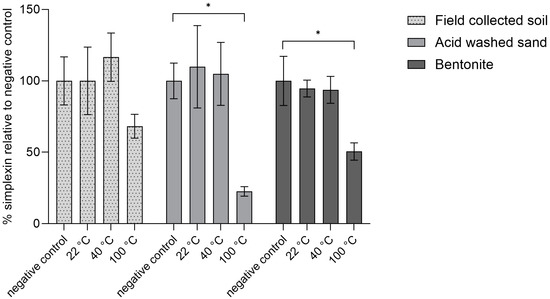 Percentage isolated simplexin decrease for each autoclaved binding agent (n = 3) after heat treatment for 1 h relative to negative control (100%). Significant differences between treatment groups vs. negative controls (no heat treatment) are indicated by asterisks (p < 0.05).