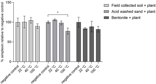 Percentage simplexin decrease in Pimelea plant material (n = 3) for autoclaved soil, sand and bentonite materials after heat treatment for 1 h relative to negative control (100%). Significant differences between treatment groups vs. negative controls (no heat treatment) are indicated by asterisks (p < 0.05).
