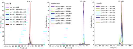 Extracts from simplexin bound with sterilised field-collected soil, acid-washed sand and bentonite incubated at 100 °C were also analysed to identify simplexin breakdown products using UPLC-MS/MS. Three simplexin breakdown products (Figure 6) were identified based on HRAMS corresponding to molecular formulae C20H24O6, C30H42O7 and C30H46O9 (Figure 7) and were given the trivial names polyol (3), monoester (4) and pentol (5) respectively. These products were not observed during UPLC-MS/MS analysis of the extracts from the negative control experiments. The mass spectra of the breakdown products showed strong intense [M + H]+ adduct peaks in positive ionisation mode. The incubated degradation products had molecular formulae matching the H2SO4 catalysed hydrolysis/elimination products described in Loh et al. [35], with their formation in this instance promoted by heat. However, the H2SO4 hydrolysis product named monoester polyol (6) reported in Loh et al. [35] was absent in this study in extracts from simplexin bound with sterilised field-collected soil, acid-washed sand and bentonite incubated at 100 °C samples.