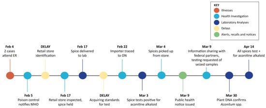 Federal agency involvement was delayed in BC as jurisdiction over KGP was unclear and toxin identification methods were unavailable. As the store sold both categories of products, this created uncertainty during the initial review. Plant DNA testing was initially offered, but the information conveyed was that the treatment of spices, such as boiling, high-heat drying and grinding, could lead to sub-optimal testing results, described as a ‘long shot’. A decision was made to seek a laboratory that could test for the food toxin, rather than test for the plant material contained in the spice. Aconitine was detected in a NHP lab 27 days after the illnesses occurred due to delays in obtaining reference standards for the method. Federal authorities deployed the available plant DNA testing methods, which found Aconitum spp. in sand ginger spice 53 days after illnesses, and developed aconitine methods to confirm the initial findings of aconitine 68 days after illnesses.