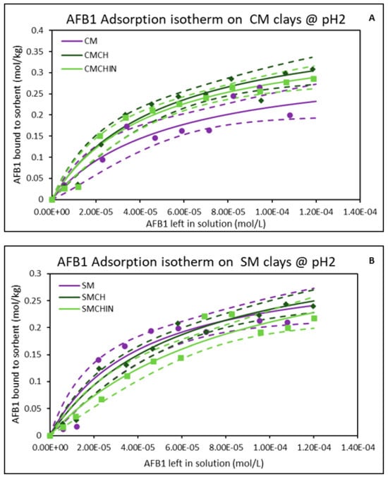 Adsorption isotherms of AFB1 onto binding surfaces of (A) CM-clays and (B) SM-clays at pH2. SMCHin; chlorophyllin-amended sodium montmorillonite; SMCH: chlorophyll-amended sodium montmorillonite; SM: sodium montmorillonite; CMCHin; chlorophyllin-amended calcium montmorillonite; CMCH: chlorophyll-amended calcium montmorillonite; CM: calcium montmorillonite.