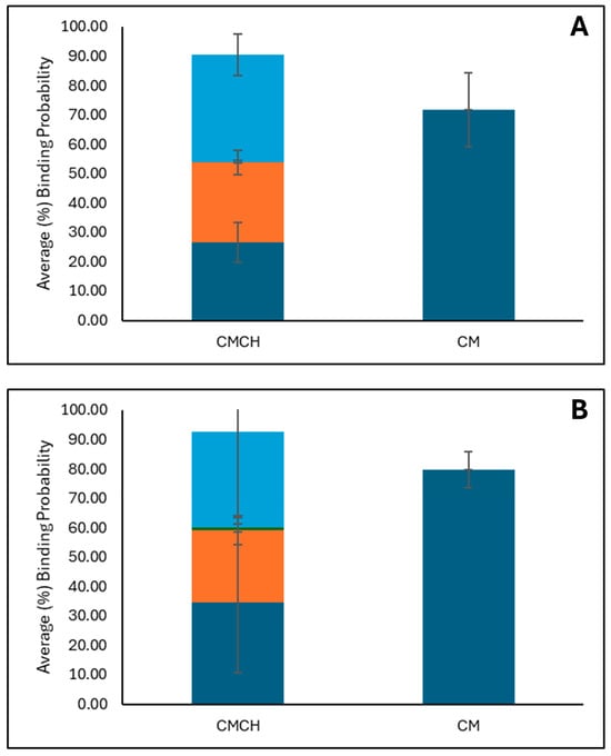 The panels (A,B) show the average percentage binding probability of AFB1 at pH2 and pH7, respectively, to chlorophyll-amended clay (CMCH) and parent clay (CM). Direct, direct-assisted, direct-helped, and indirect-assisted interactions are shown in dark blue, orange, green, and cyan, respectively. The average values are calculated from triplicate runs. The error bars denote the standard deviation values calculated from triplicate runs.