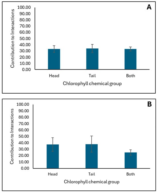Figure 5 presents the percentage contribution of each chlorophyll chemical group to the interactions with AFB1 at both pH2 and pH7 (Figure 5A,B, respectively). The interaction between AFB1 and chlorophyll’s chlorin ring (head) or alkyl chai (tail) is approximately equally probable at both pH conditions within the simulations.
