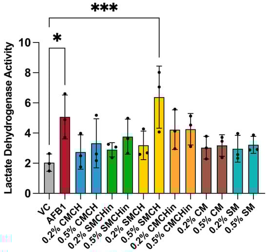 AFB1 exposure caused significantly elevated levels of LDH in Hep G2 cells, reflecting hepatic toxicity (Figure 6). Each clay-treated exposure condition did not show significantly elevated levels of LDH in spent media, with the exception of 0.5% (w/v) SMCH. Generally, there appeared to be a protective effect associated with clay treatment.