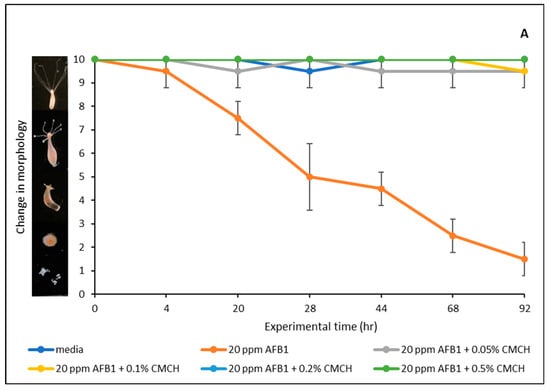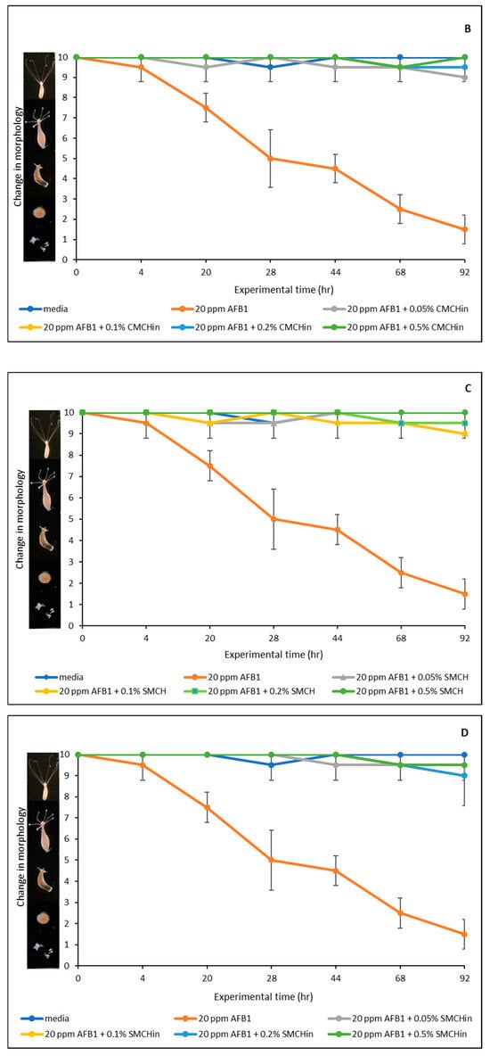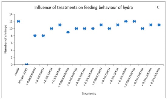 Figure 7 displays the findings of the AFB1 toxicity assessment conducted on hydra in vivo. AFB1 exposure between 10 and 200 ppm showed significant toxicity to hydra morphology. In particular, AFB1 impaired the hydra’s morphology between 50 and 100 percent at different doses of 10, 20, 40, 80, 100, and 200 ppm. Notably, after 48 h of exposure, the hydra subjected to concentrations greater than 20 ppm of AFB1 completely disintegrated. Therefore, 20 ppm was used for the detoxification studies and evaluation. The hydra colony was considerably shielded against AFB1 toxicity by treatment with different doses of the montmorillonite-clay-based sorbent additives, ranging from 0.05% to 0.5% (w/v), as seen in Figure 8. In particular, protection ranged from 33% to 93% for SM-amended clays (SMCH and SMCHin) at 0.2% and 0.5% inclusion, whereas it ranged from 87% to 100% for CM-amended clays (CMCH and CMCHin). Interestingly, CMCH provided full (100%) protection at both 0.2% and 0.5% inclusion. The feeding behavior of Hydra vulgaris was significantly impaired by 20 ppm of AFB1; however, the inclusion of the clays prevented this toxicity.