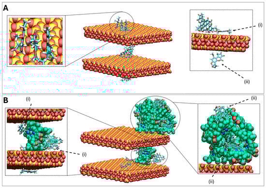 Panels (A,B) show the last snapshot of a particular simulation of AFB1 in complex with CM and CMCH, respectively, at pH2. The pictures in the center of the panels are zoomed-out representations while the picture on the left and the right of the panels correspond to zoomed-in representations, with different angles shown for clarity. The clay layers are shown in vdW representation, colored by atom type. The carbon atoms of chlorophyll amendments are colored in green, while the magnesium, nitrogen, and oxygen atoms are colored by atom type. The AFB1 molecules are shown in licorice representation, colored by atom type. The calcium ions that are within a distance of 3.5 Å of clay, chlorophyll, or AFB1 are shown in vdW representation, colored in tan. The hydrogen atoms of clay and chlorophyll molecules were omitted for clarity. The indicated molecules (i) and (ii) are discussed in the main text.