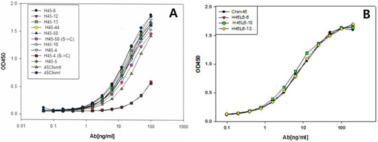 ELISA results. (A) Binding of 12 soluble scFvs with BoNT/A was analyzed using ELISA. (B) Three full-length humanized antibodies with BoNT/A was analyzed using ELISA.