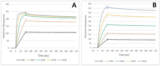 Sensorgram for measuring the dissociation constant between (A) Hz45 and the C-terminal domain of BoNT/A and between (B) Hz45 and BoNT/A.