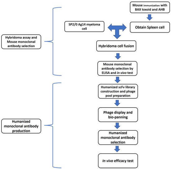 Schematic representation of this study. Splenocytes were prepared from immunized mice. They were fused with a myeloma cell line to obtain hybridoma cells. The murine BoNT/A antibody was selected via ELISA and murine bioassay. The heavy- and light-chain genes of the murine monoclonal antibody were analyzed by overlap PCR. The humanized scFv library was cloned into a phagemid vector. Bio-panning was performed to obtain specific antibodies. The humanized monoclonal antibody was selected via ELISA and murine bioassay. Finally, the selected humanized antibody was tested for therapeutic and prophylactic efficacy.