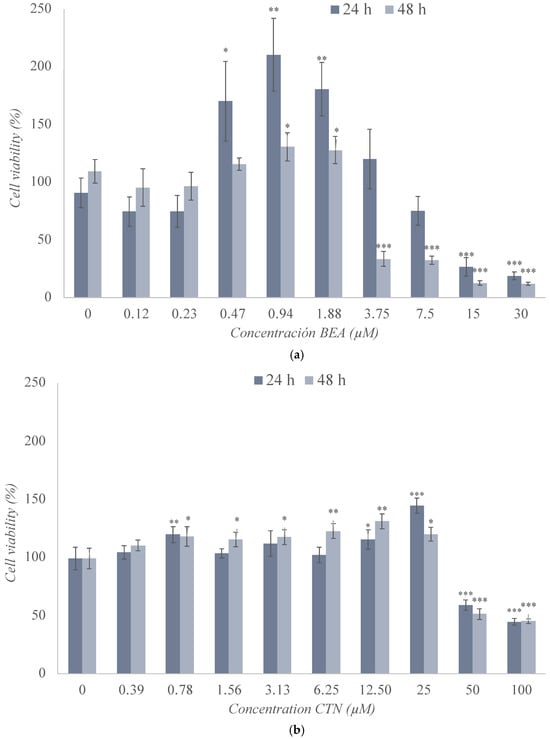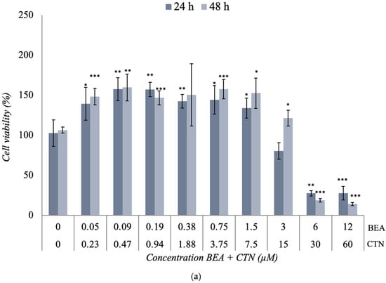 The combination of BEA + CTN [1:5] μM, presented in Figure 3a, showed a significant increase in viability at the first concentrations studied compared to the control. This increase was dropped down from [6 + 30] μM to a percentage of viability of 27% and 14% after 24 h and 48 h of exposure ([60 + 12] μM, (p ≤ 0.001)), respectively. In this case, the IC50 value was obtained at the concentrations of [4.5 + 22.5] μM and [4.8 + 24] μM after 24 h and 48 h, respectively (Table 2 and Figure 3a).