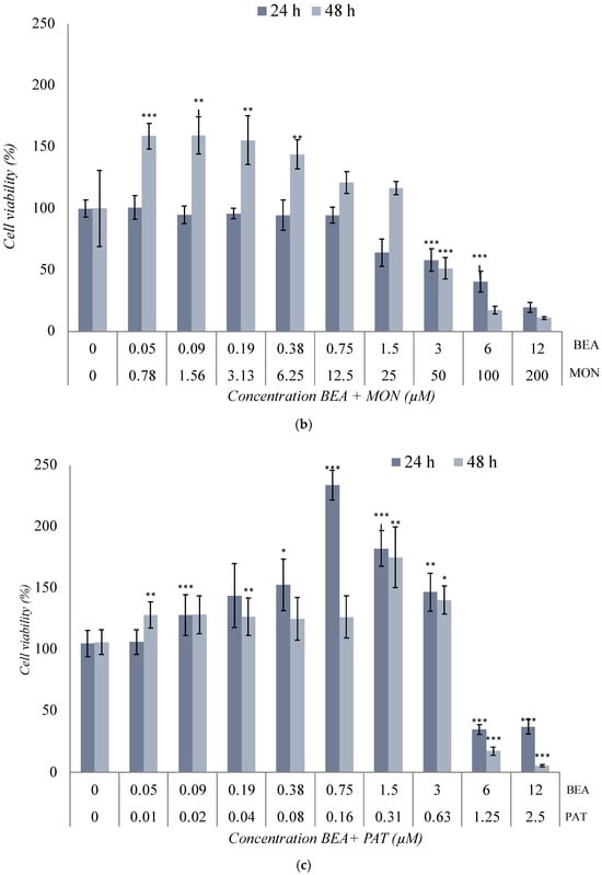 The combination of BEA + MON [3:50] μM in Figure 3b generated a significant decrease (p ≤ 0.001) in cell viability from [1.5 + 25] μM at the two exposure times used, reaching cell viability values of 19% and 10% after 24 h and 48 h of exposure, respectively (Figure 3b). However, at lower concentrations of exposure, cell viability was higher after 48 h compared to the results obtained after 24 h. This increase was up to 1.59-fold (p ≤ 0.001) higher than its control. In this case, the IC50 value was reached at [4.5 + 75] μM and [3 + 50] μM after 24 h and 48 h, respectively (Table 2).