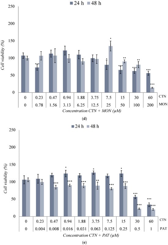 Cytotoxic effect of (a) BEA + CTN [1:5], (b) BEA + MON [3:50], (c) BEA + PAT [6:1.25], (d) CTN + MON [3:10], (e) CTN + PAT [60:1], and (f) MON + PAT [200:1] in SH-SY5Y monolayer cultures obtained by MTT assay after 24 h and 48 h of exposure. All values are results of three independent experiments (n = 3) with eight replicates and expressed as mean ± SD. p ≤ 0.05 (*), p ≤ 0.01 (**), and p ≤ 0.001 (***) corresponding to differences with respect to the control.