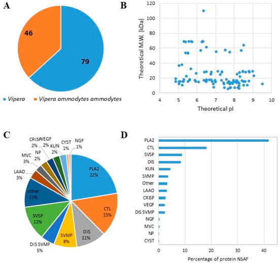 Proteomic analysis of the lyophilised venom of Balkan Vipera ammodytes ammodytes. (A) Pie chart showing the number of proteins identified as belonging to Vipera ammodytes ammodytes or other Vipera species. (B) Scatter plot showing the theoretical isoelectric point (pI) and molecular weight (M.W.) of the detected proteins. (C) Pie chart showing the distribution of the detected proteins (the percentage is reported in each slice) related to each family. (D) Bar graph with the number of protein NSAFs detected for each family (PLA2; SVSP; SVMP; LAAO: l-amino acid oxidase; KUN: kunitz peptide; CRiSP: cysteine-rich secretory protein; MVC: minor venom component; CTL; DIS; NP: natriuretic peptide; CYST: cystatin; VEGF: vascular endothelial growth factor; MVC: minor venom component).