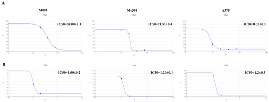 IC50 calculation. (A) Dose–response curve of M001, Me501 and A375 cells cultured in 24-well plates and treated with increasing concentrations of cisplatin (0–80 μM) for 24 h. The y-axis shows the rate of cell viability, while the x-axis shows the cisplatin concentration (μM). The dose–response curve was obtained by using https://www.aatbio.com/tools/ic50-calculator (accessed on 25 January 2025). The graph is representative of three experiments. (B) The dose–response curve of M001, Me501 and A375 cells cultured in 24-well plates and treated with decreasing concentrations (0–2.5 μg/mL) of viper venom for 24 h. The y-axis shows the rate of cell viability, and the x-axis shows the viper venom concentration (μg/mL). All experiments were performed in triplicate and repeated at least three times. Data are expressed as mean ± SD.