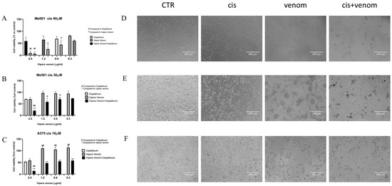 Effect of viper venom alone and combined with cisplatin in M001 (A), Me501 (B) and A375 (C) melanoma cells for 24 h of treatment. The cell viabilities were determined after the final treatment. Each point represents the mean ± SD relative to the control cells of three independent experiences, with at least five images for each point being analysed, n = 5. *,# Statistically significant vs. viper venom at p < 0.05; **,## Statistically significant vs. viper venom at p < 0.01; Statistical analyses were performed by using a one-way ANOVA test. (D–F) morphological analysis of changes in phase contrast microscopy of M001, Me501 and A375 cell lines, respectively. CTR: control, Cis: cisplatin treatment, venom: viper venom treatment, cis + venom: combined treatment.