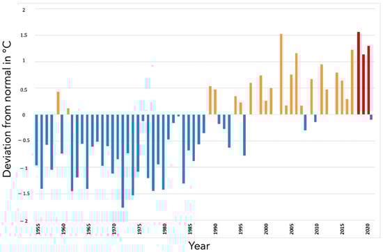 Deviation from the 1981–2010 normal of the average temperatures recorded in °C from March 1 to October 30—corresponding to the maize growing season—between 1955 and 2021. Orange bars: years hotter than normal; blue bars: years colder than normal; red bars: years of the survey, hotter than normal.